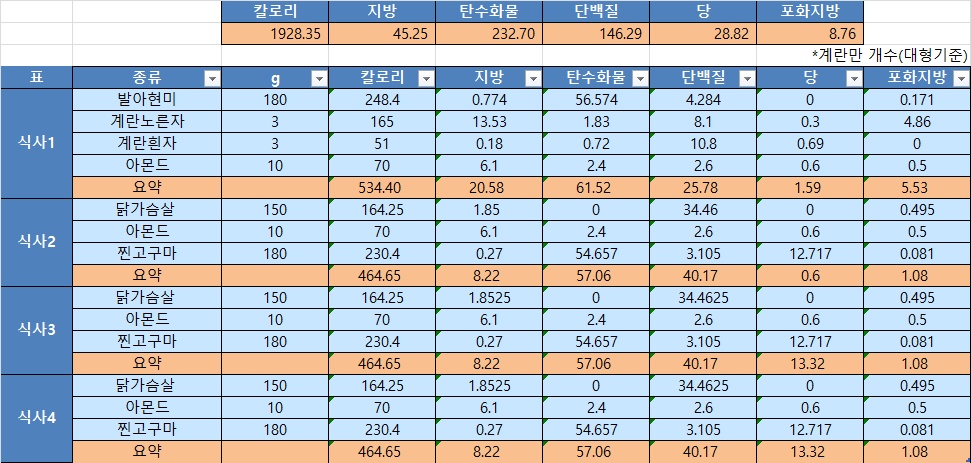 PT선생님께서 짜주신 식단표..슬슬 지겨워진다.. 똑같은거 매번 먹기가 이렇게 힘들다니..