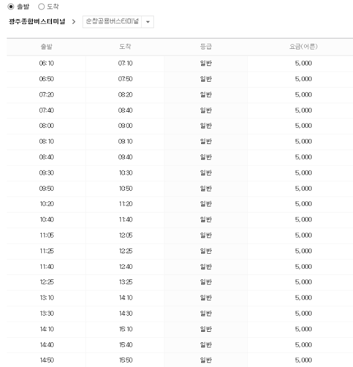 광주 -> 순창 : AM 06:50 ~ AM 07:50