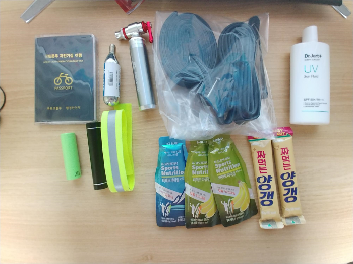 국토종주 수첩, CO2카트리지 2개 및 인잭터, 여분 튜브2개 그리고 주걱, 썬크림, 라이트 밧데리 3개와 밧데리용 보조충전기, 야간라이딩 시 필요한 야광발찌,
